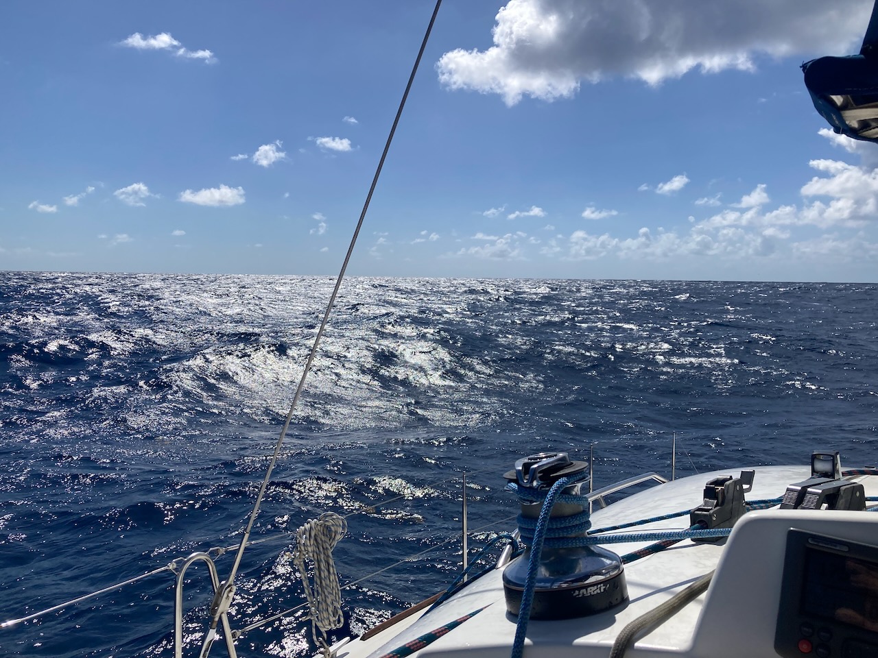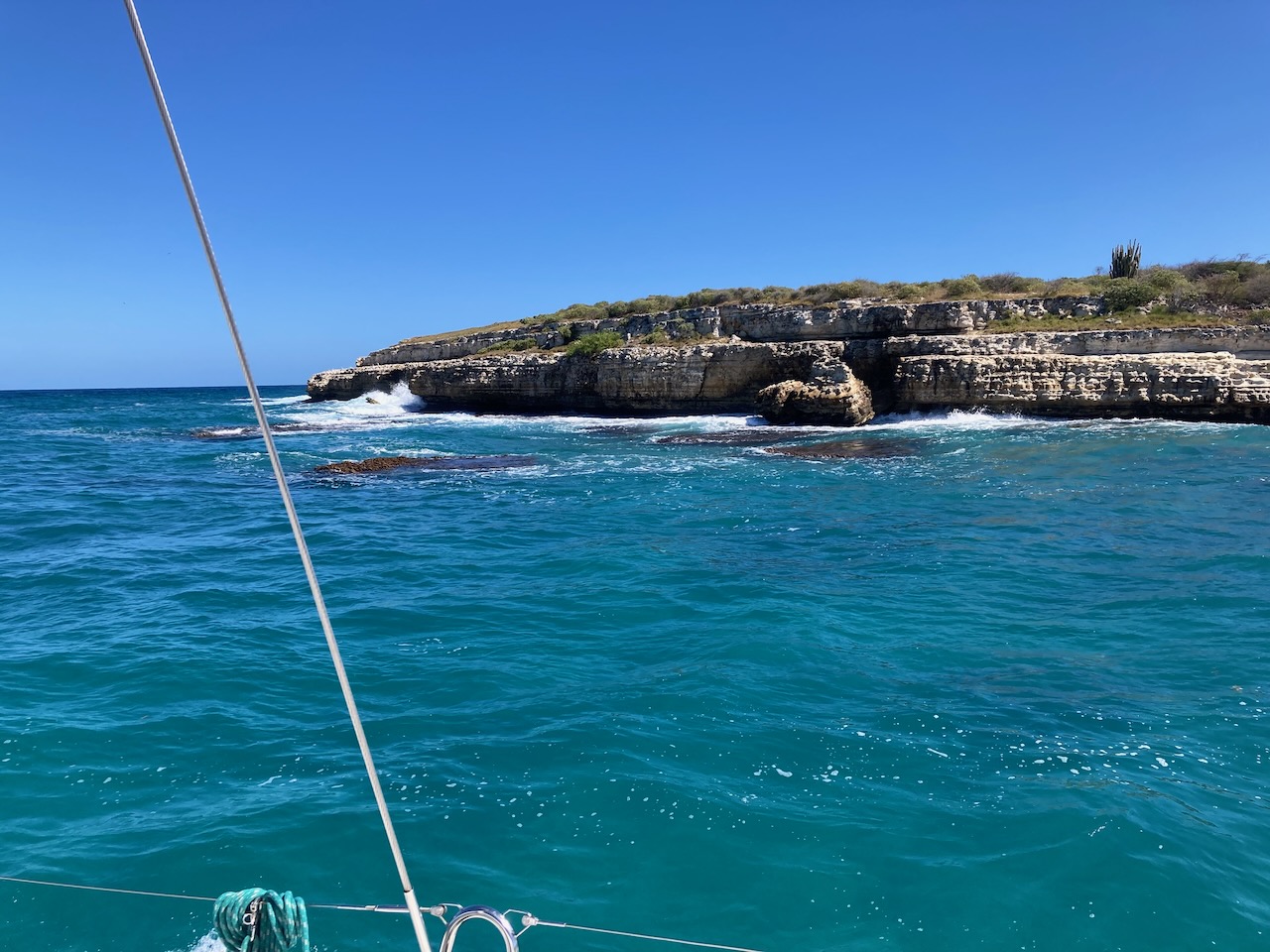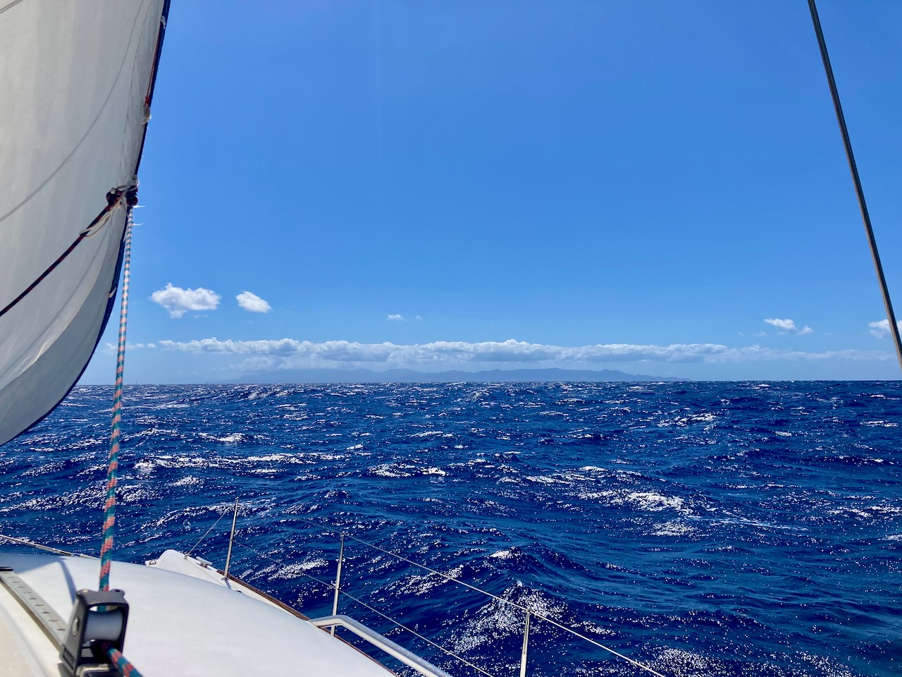Leider war die Anreise nicht so richtig schön. Wir hatten mächtig Wind und natürlich auch ziemlich hohe Wellen, so dass teilweise nicht so richtig Freude am Segeln aufkam. Wir waren alle froh, als wir in die Rifflandschaft im Norden Guadeloupes fuhren und die irren Wellen endlich weg waren. Puh, wir waren ganz schön geschafft!