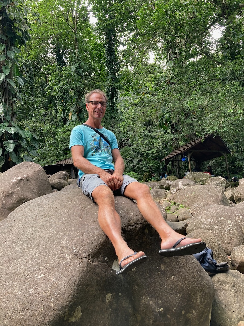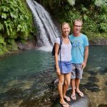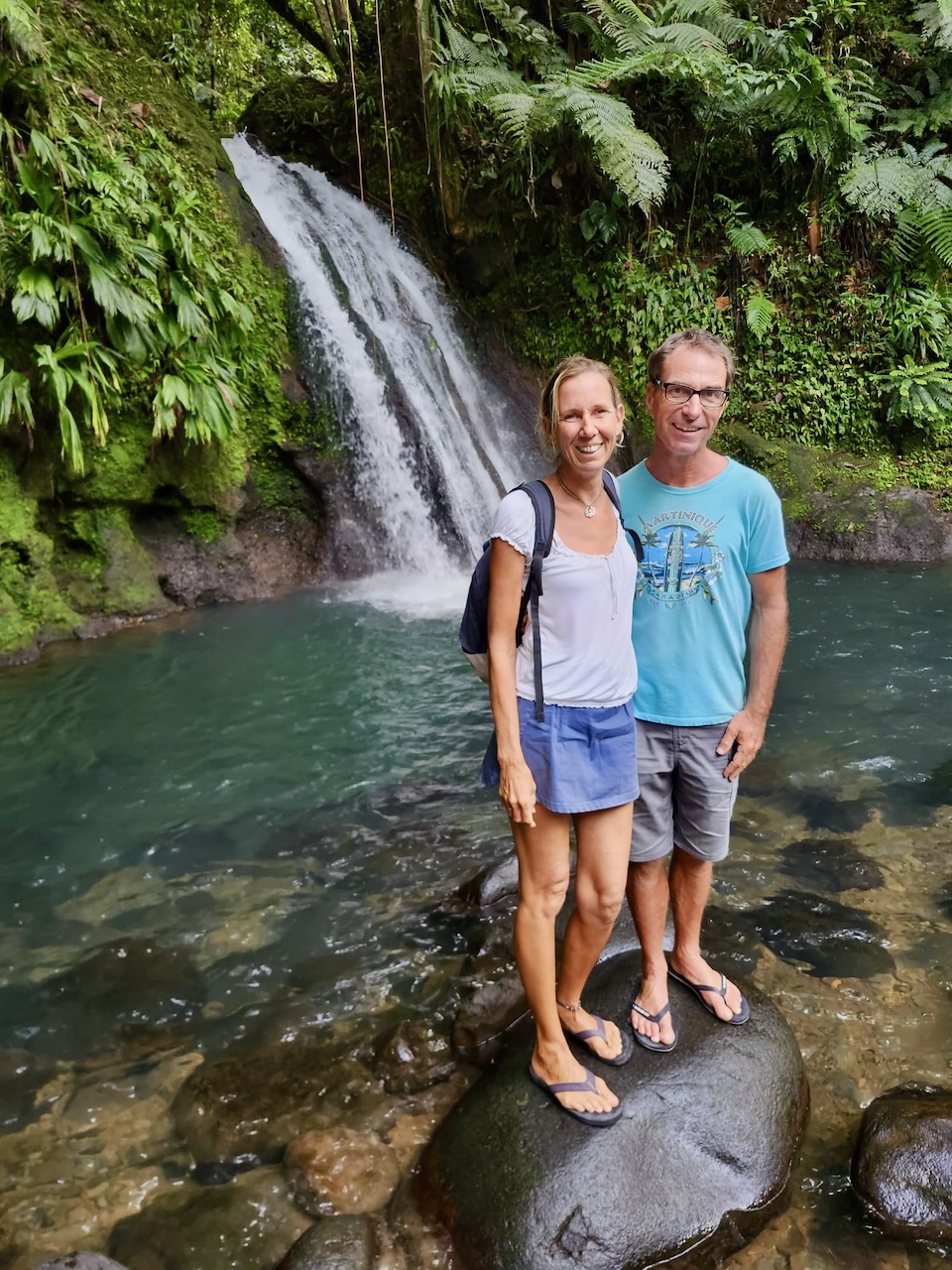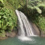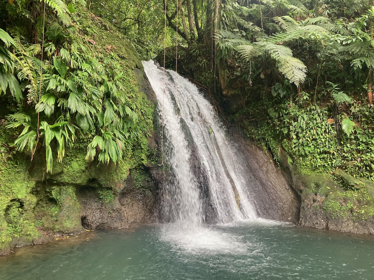 Und den einfachsten Tagesordnungspunkt hatten wir uns für den Schluss aufgehoben. Da ging es dann auf dem Rückweg noch schnell zum „Kreuzfahrtschiff-Wasserfall“. Eigentlich heißt dieser Wasserfall „Cascade aux Ecrevisses“, aber dort werden immer die ganzen Kreuzfahrtschiff-Terroristen äh Touristen hingekarrt, deshalb haben wir ihn umbenannt. Auf unserer Schwierigkeitsskala würde er ca. eine 0,5 bekommen, weil es auf einem mit Steinen gepflasterten Weg ebenerdig ein paar hundert Meter in den Regenwald geht, uns hat man jedoch gesagt, dass dieser Wasserfall auf den Kreuzfahrtschiffen mit einer 3 gewertet wird. Da will ich ja nicht wissen, was eine 1 ist ;-)))