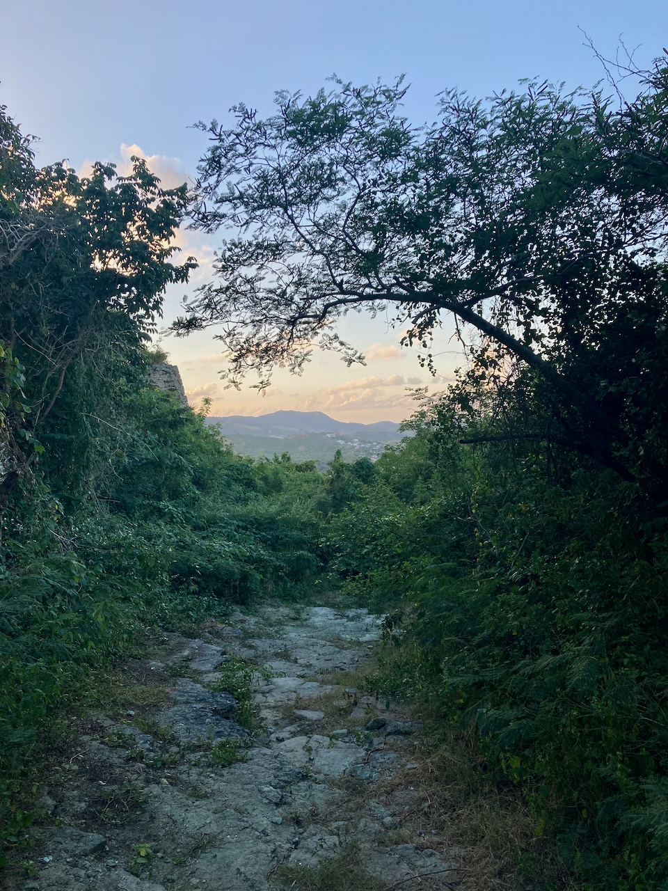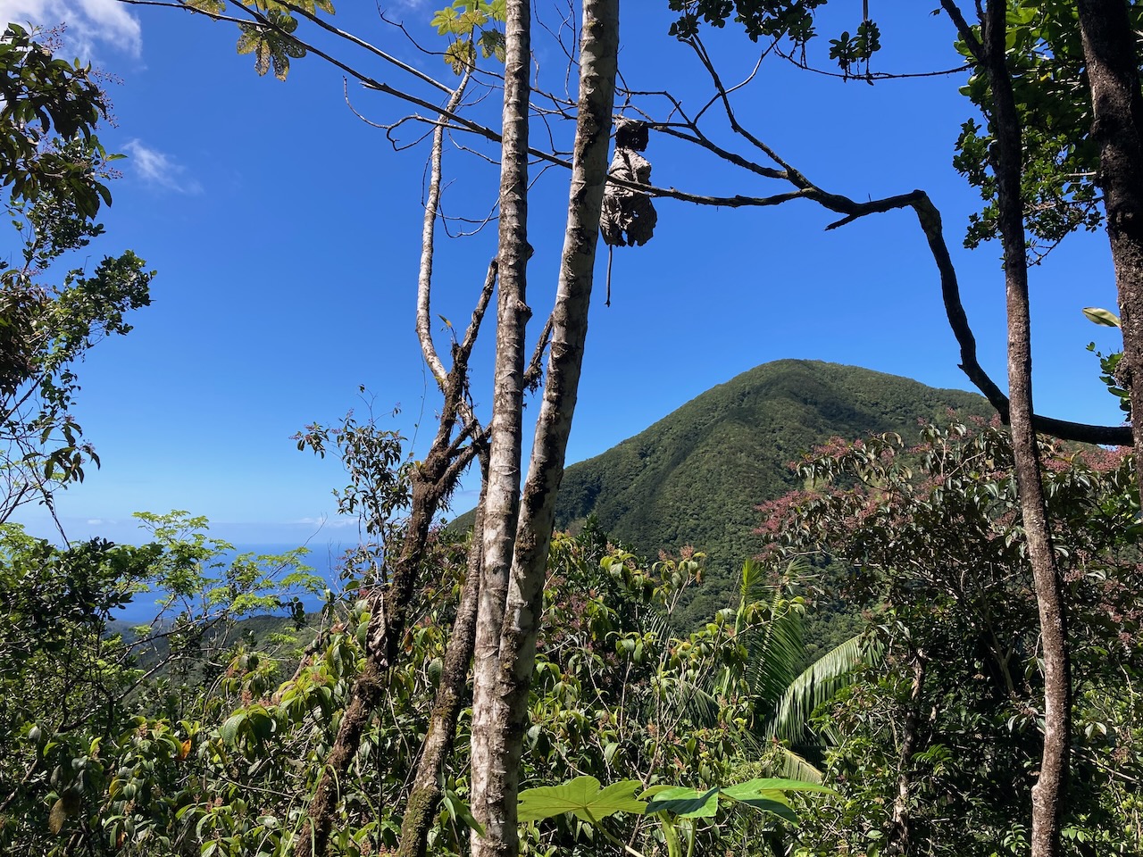 Der Aufstieg machte dennoch Spaß. Ein schmaler Pfad führte den Hügel hoch, schlängelte sich durch den Regenwald und gewährte immer mal wieder einen kurzen Blick auf den zweiten Mamelle und die Westküste Guadeloupes.