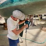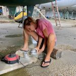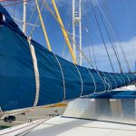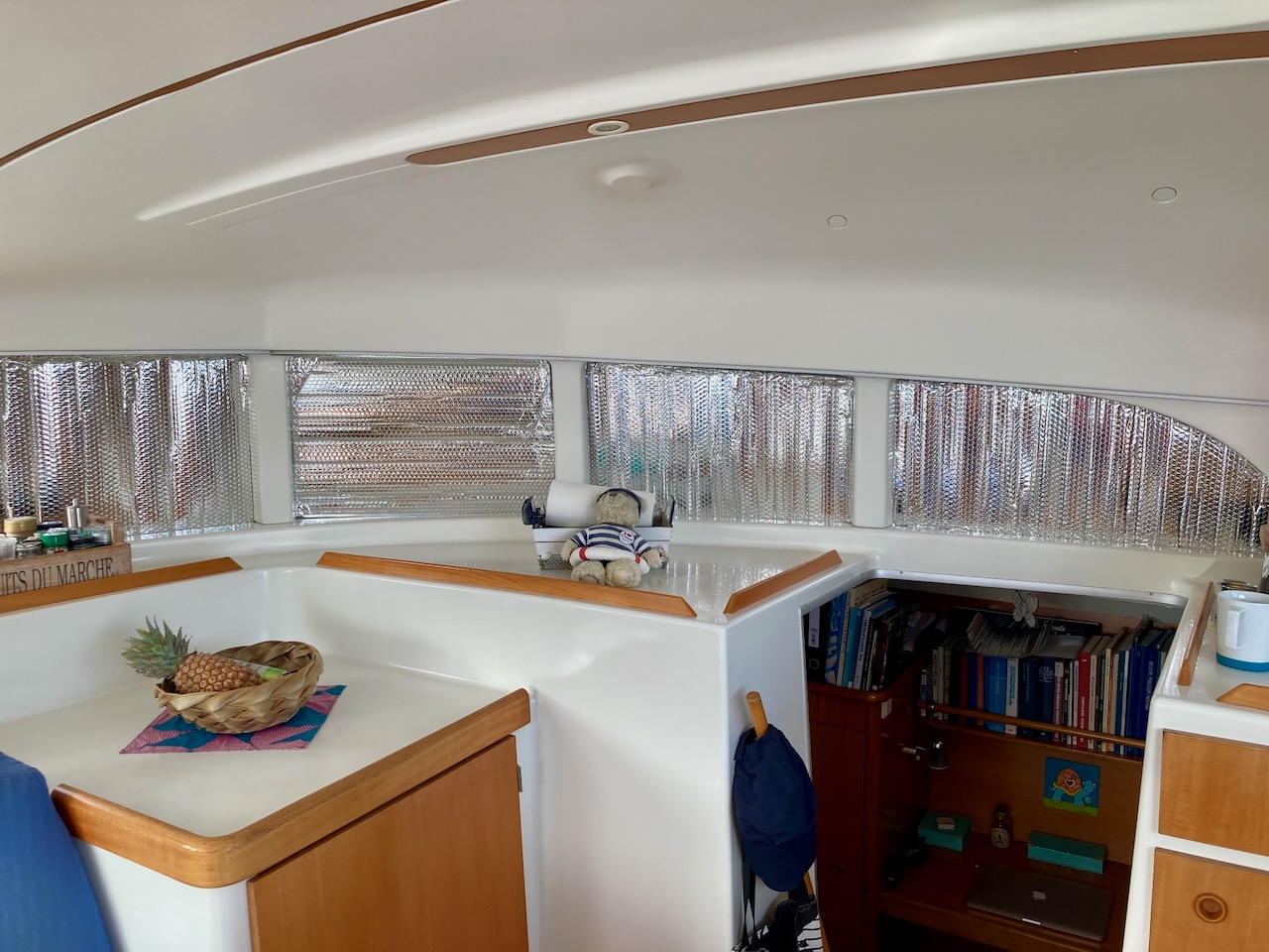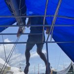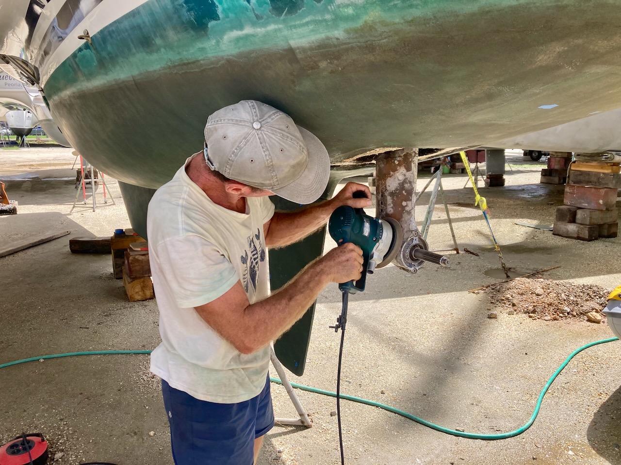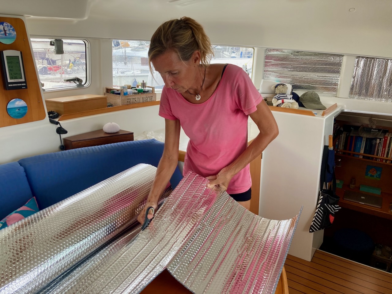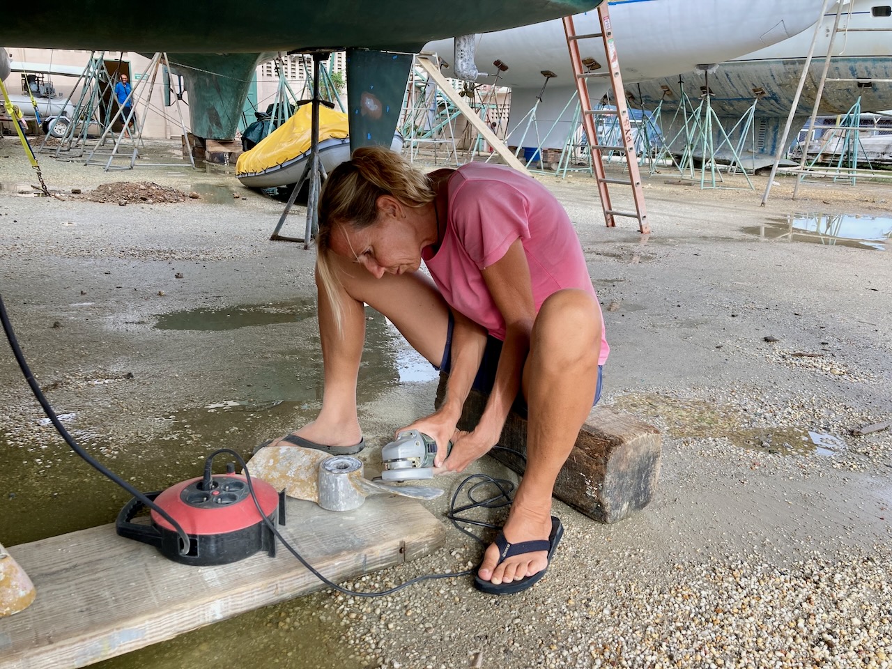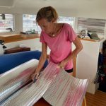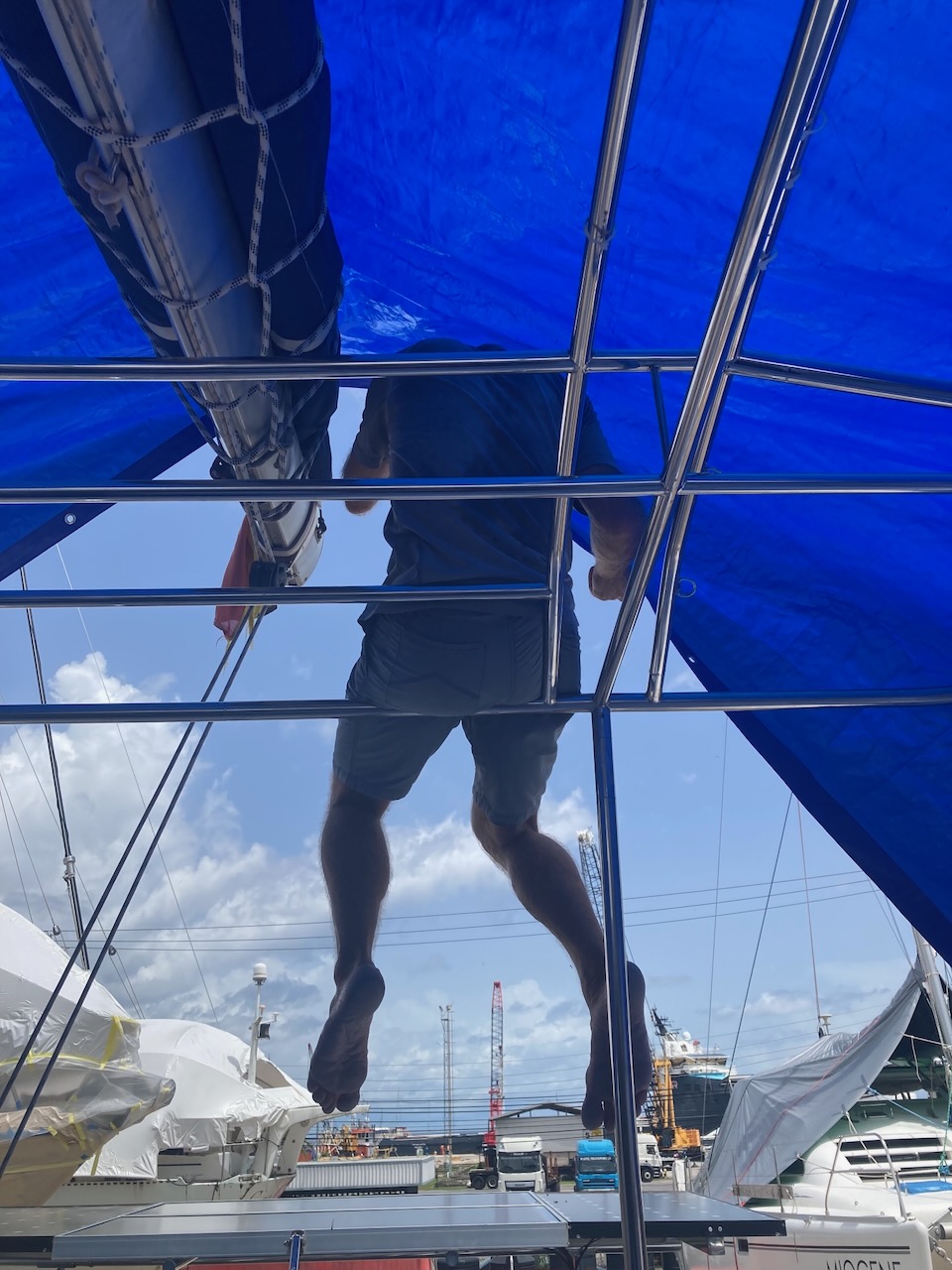 Als alles vorüber war, besahen sie sich den Schaden. Zwei Pfeiler ihres Biminis (das Dach draußen über dem Cockpit) waren eingeknickt, eine Seite des Biminis war weggerissen, überall auf dem Deck lagen Splitter und Äste und sie hatten vorne im Rumpf ihres Bootes ein Loch unterhalb der Wasserlinie. Dort hatte sich anscheinend ein Ast der Mangroven in den Rumpf gebohrt und Wasser lief ins Boot.