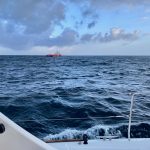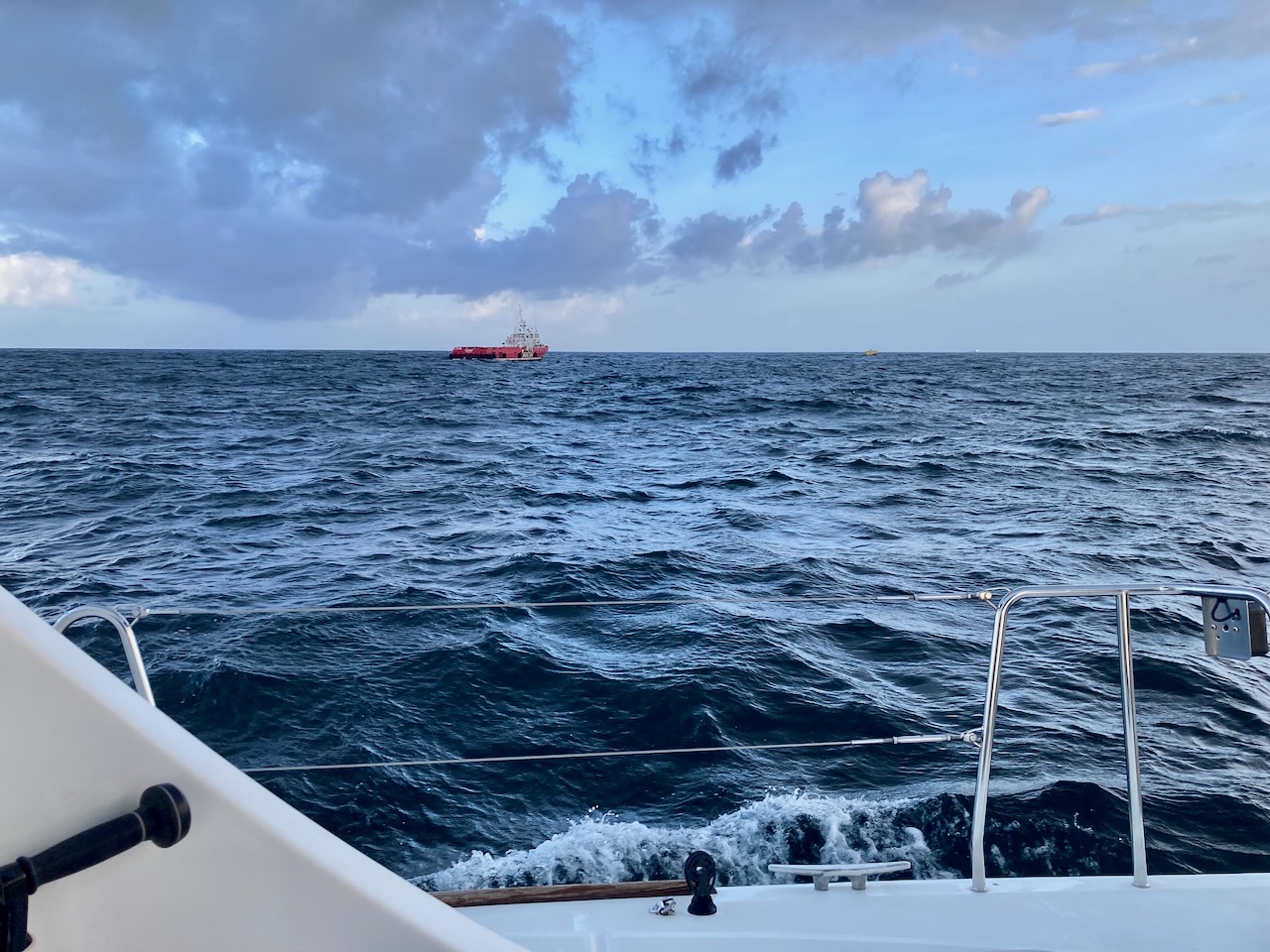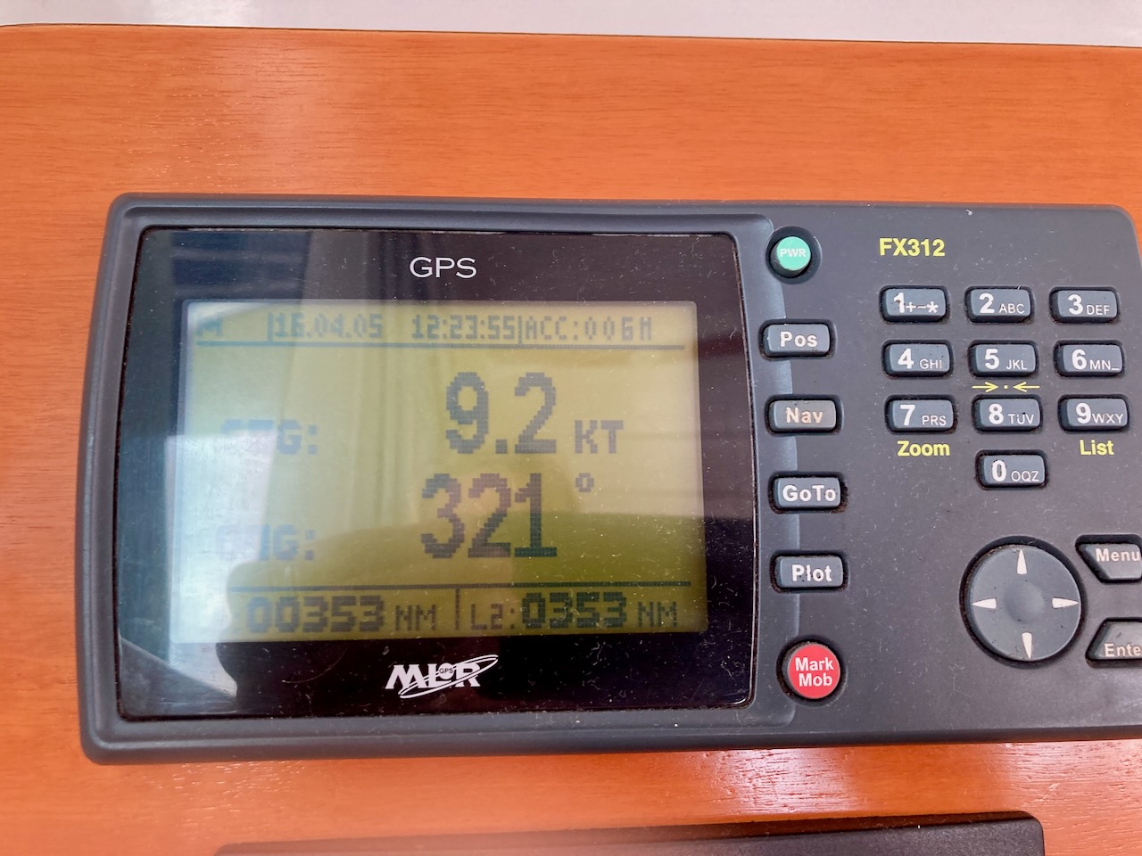 Die weitere Fahrt verlief glücklicherweise weniger aufregend. Einmal kreuzte ein kleiner Frachter unseren Weg und sollte laut unserer AIS-Anzeige 300m vor uns vorbei gehen. Das fanden wir dann doch etwas nah und wichen so weit aus, dass er am Ende mit 0,8 Seemeilen Abstand an uns vorbei fuhr.
