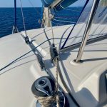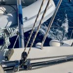 Alles war wunderbar, bis es nach ca. einer Stunde plötzlich einen lauten Knall und Schlag gab. Ich hörte Kai draußen sehr aufgeregt fluchen und rannte sofort raus. Die Großschot war gerissen und unser Baum war in unsere Backbord-Want gekracht. Jetzt schlug er wild hin und her. Glücklicherweise erfasste Kai die Lage sofort, schnappte sich ein Ende der gerissenen Großschot und holte damit den Baum dicht. Dann konnten wir erst einmal kurz aufatmen und checken, ob noch mehr kaputt gegangen war. Zu unserem großen Glück war das nicht der Fall. Dadurch, dass es sehr wenig Wind hatte, war nicht viel Druck im Segel gewesen. Das hätte ansonsten so richtig böse ausgehen können. Im schlimmsten Fall wäre der Baum so fest in die Want gekracht, dass es unseren Mast umgehauen hätte. Das war also eine extrem gefährliche Situation gewesen. Auf Einrumpfbooten sind so bereits Segler ums Leben gekommen, weil sie von dem ausrauschenden Baum am Kopf getroffen oder über Bord geschleudert wurden. Das kann bei uns nicht so schnell passieren, weil der Baum ein ganzes Stück über unserem Cockpit ist. Aber trotzdem waren wir sehr erleichtert, dass nichts Schlimmeres passiert war.