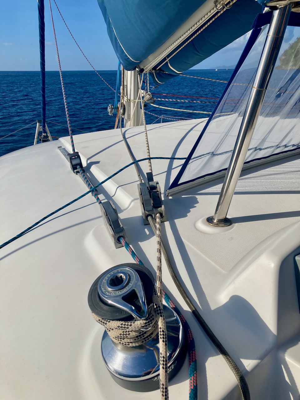 Glücklicherweise fiel Kai ein, dass ein Teil unseres alten Großfalls lang genug und auch noch stabil genug sein müsste, um die Großschot provisorisch zu ersetzen. Also alte Leine raus, „neue“ Leine rein, Segel wieder gesetzt und es konnte weiter gehen. Welch Erleichterung, dass das so glimpflich ausgegangen war und wir nun sogar weiter segeln konnten! Aber der Schrecken saß uns gehörig in den Gliedern.