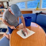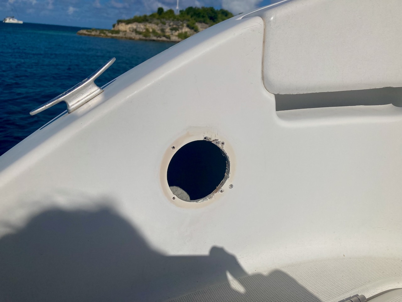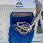 Wir machten also die Motoren an und fuhren in den Wind, um die Last aus dem Segel zu nehmen. Dann erst einmal Genua einrollen und Großsegel runter holen. Wie könnten wir das jetzt reparieren? Repariert musste es werden, sonst könnten wir nicht weiter segeln. Und da wir noch eine Strecke von fast 100 Seemeilen vor uns hatten, stand es für uns auch außer Frage, dass wir weiter motoren würden. Also entweder provisorisch reparieren oder umkehren und zurück nach Trinidad, um dort eine neue Leine zu kaufen.