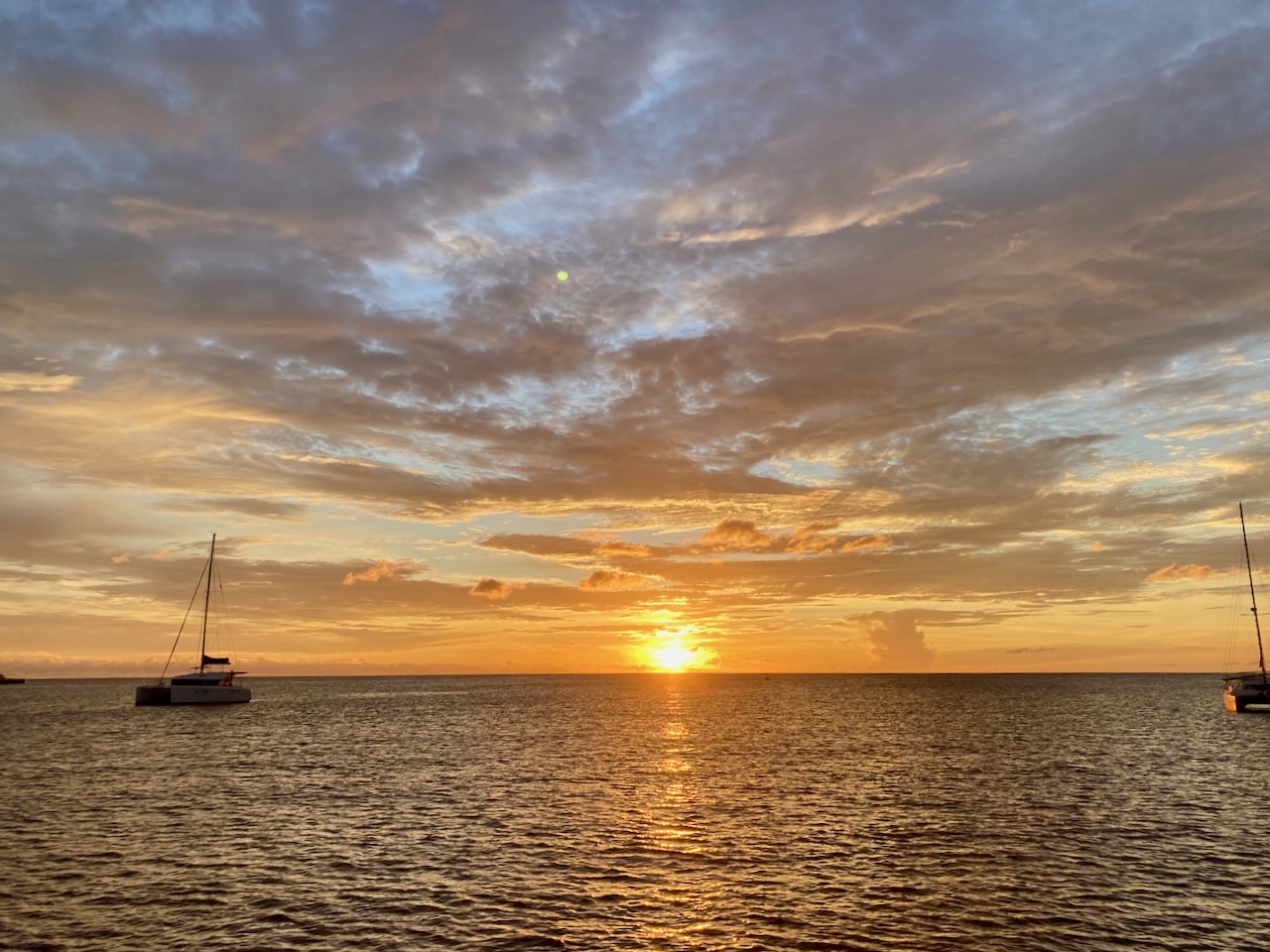 In Dominica wurden wir natürlich auch von einem schönen Regenbogen willkommen geheißen und abends durften wir einen herrlichen Sonnenuntergang genießen. Dann statteten wir unseren Freunden noch einen kleinen Besuch ab, chillten in deren Hängematte, sammelten jede Menge leckeres Obst im Garten auf, und dann ging es auch schon weiter nach Guadeloupe.